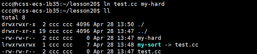 test.cc进行硬连接,生成硬连接文件my-hard,其中硬链接文件名也可以自定义