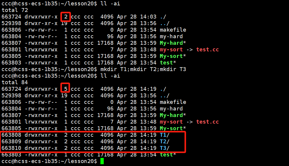 比如创建新目录后,默认与上级目录和当前目录建立硬链接文件,在当目录下创建新目录后,当前目录的硬链接数 + 1