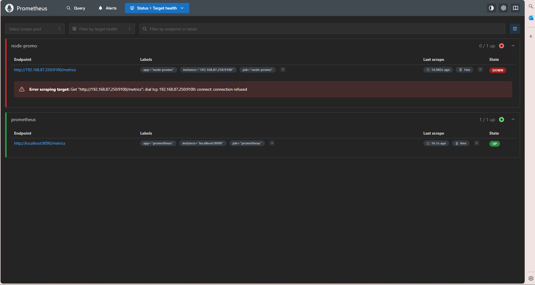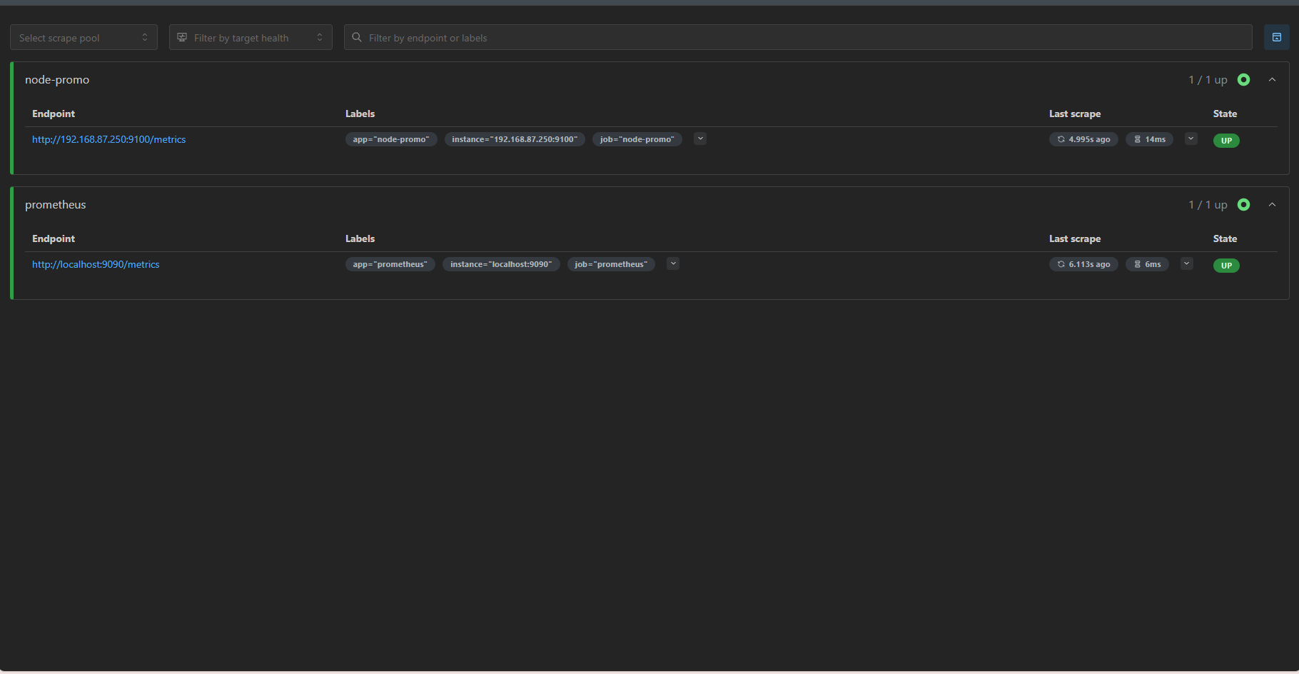 node-promo任务的状态为UP(表示监控正常)。