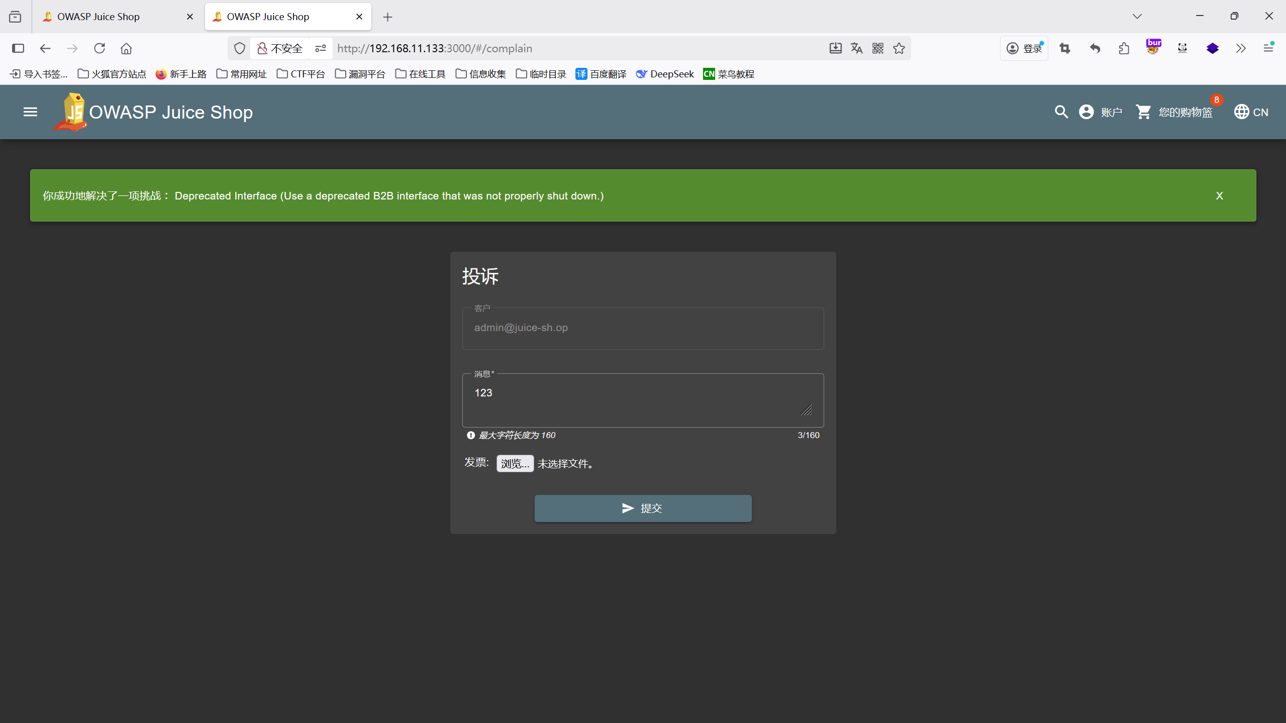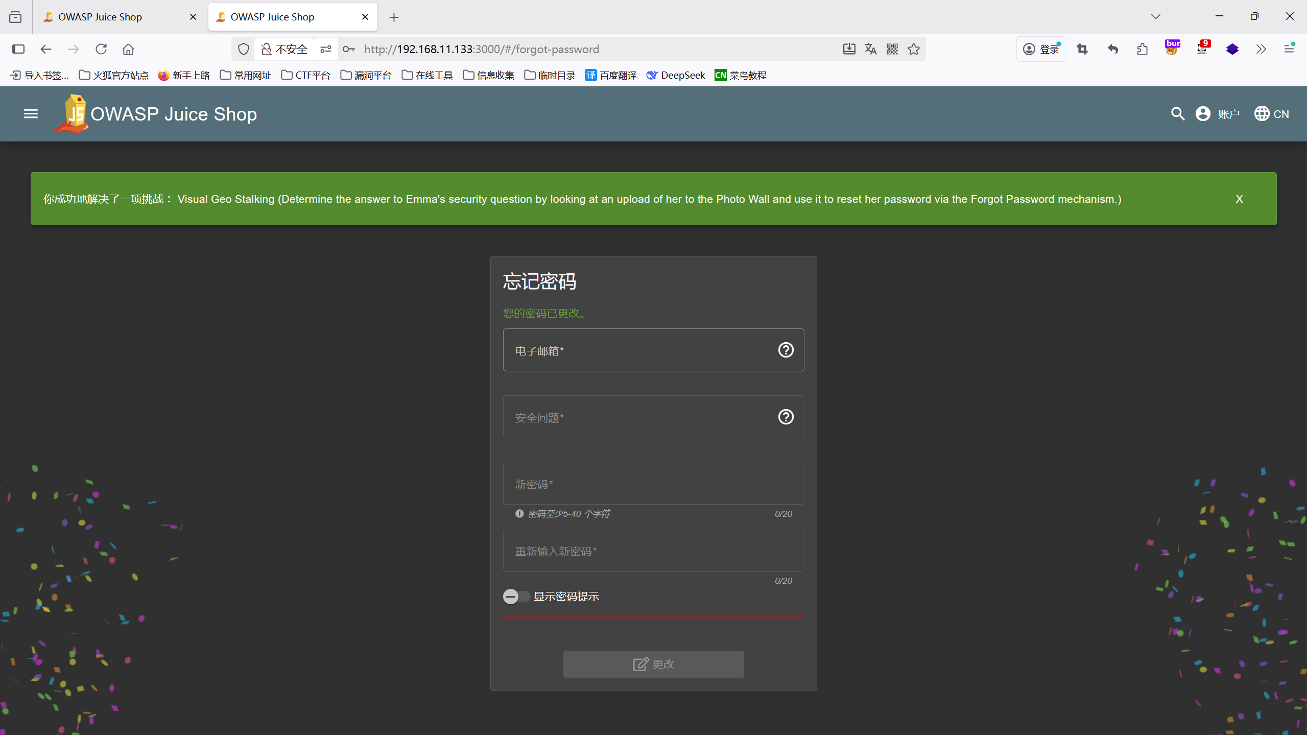 本篇是juice-shop靶场的二星挑战。靶机为kali_linux,攻击机为Windows11,靶场是目前最新版19.1.1,使用docker搭建。也由于是基于docker,有的挑战在docker环境下不兼容导致打不了,这些做不了的挑战这里就不演示了。详细配置内容和环境搭建可见专栏《juice-shop靶场挑战》的靶场搭建篇。