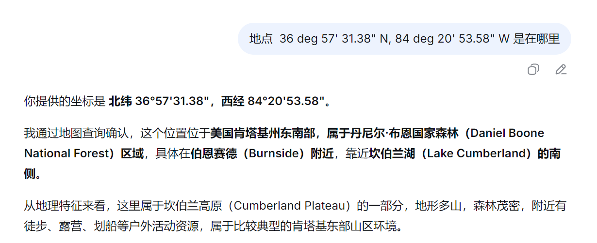 对于这个经纬度,直接问问AI是哪里,得到的位置是丹尼尔·布恩国家森林(Daniel Boone National Forest),不出意外的话这就是安全问题的答案了。