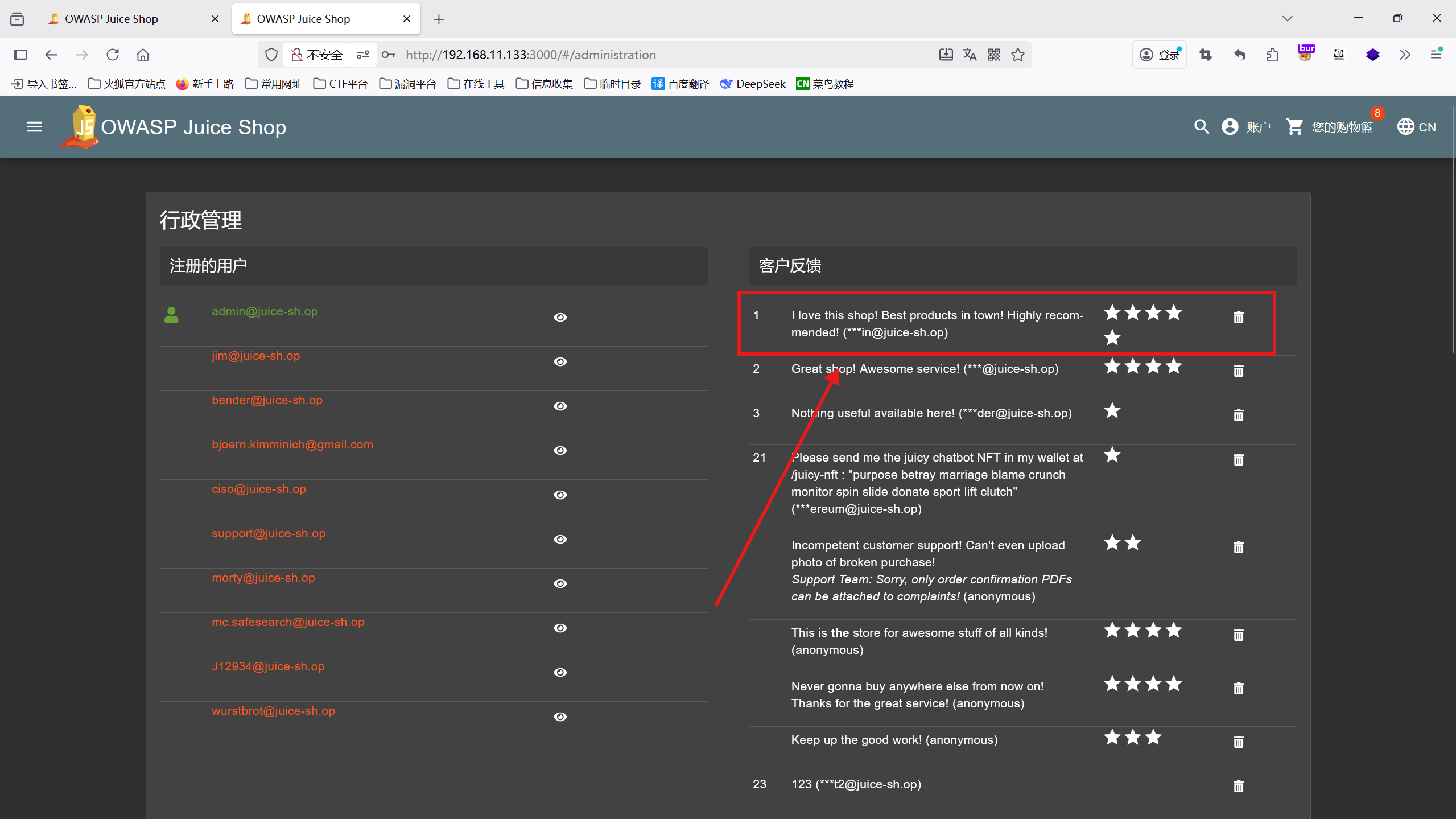 登录admin账号,前往管理页面,可以在右侧看到所有的用户反馈,五星只有一个,把它删除即可完成挑战。