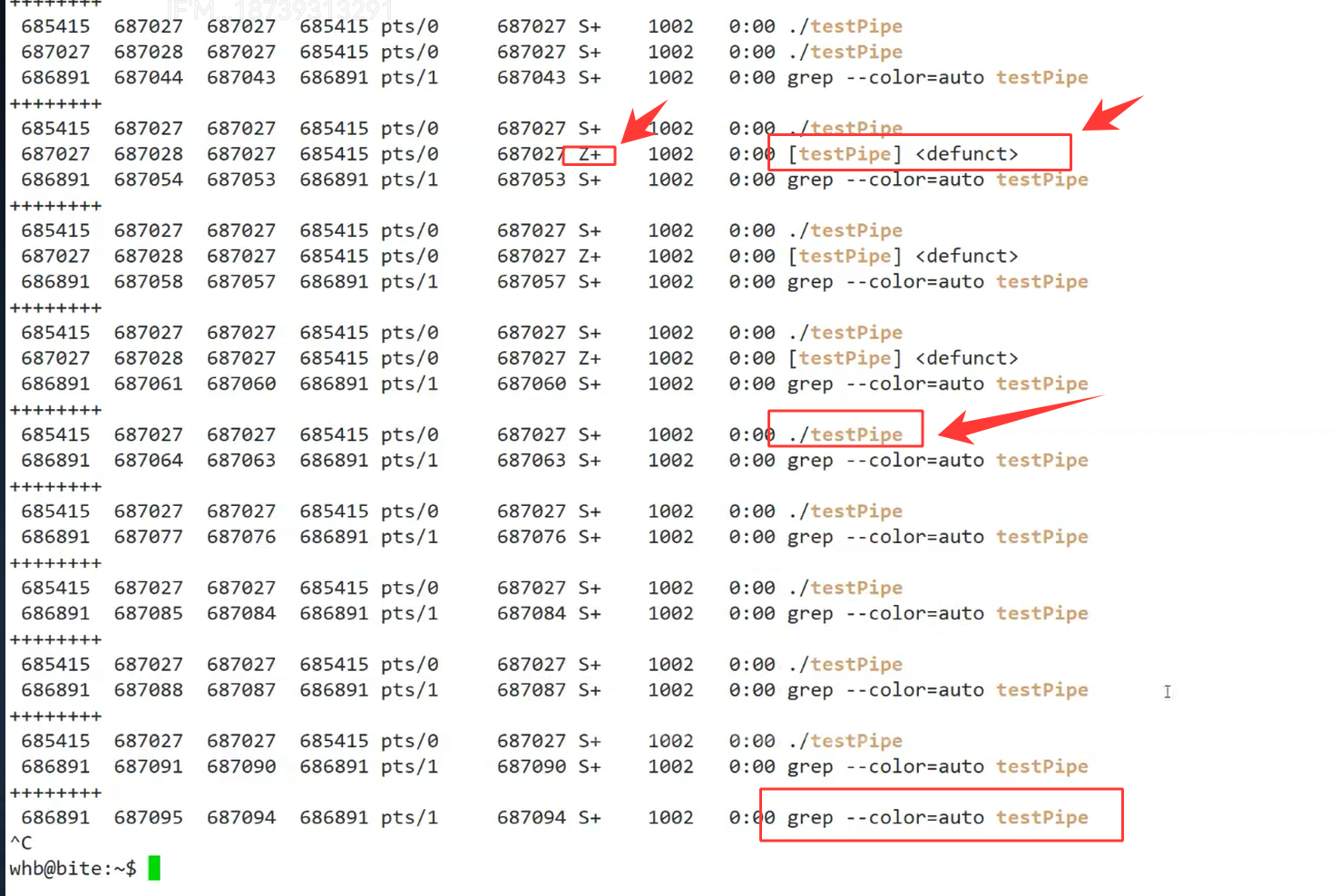 ps命令监控进程,能看到子进程(写端)一开始存在,之后很快被杀死,对应下图的监控结果。