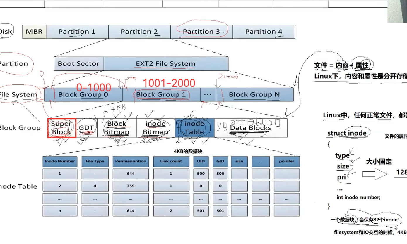 - 跨区编号:inode和数据块在整个分区内统一编号(如1-10000)