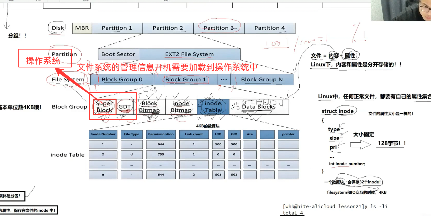 - 存储三要素:分区(容器)、inode(身份证)、数据块(内容箱)