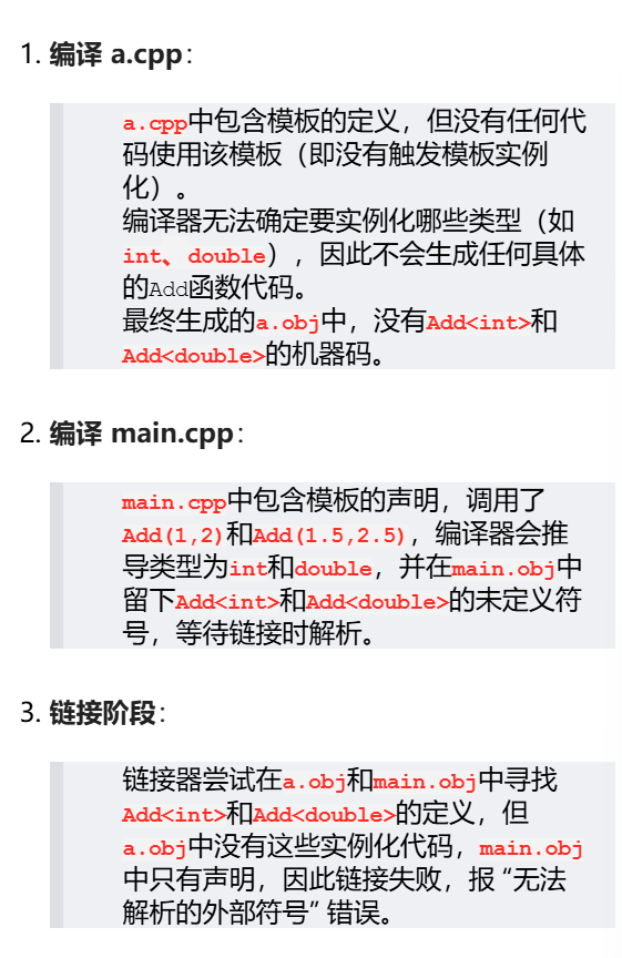 我们的模板只有在使用时才会被实例化,而在其他的文件中只有声明,而没有声明。具体的流程如图: