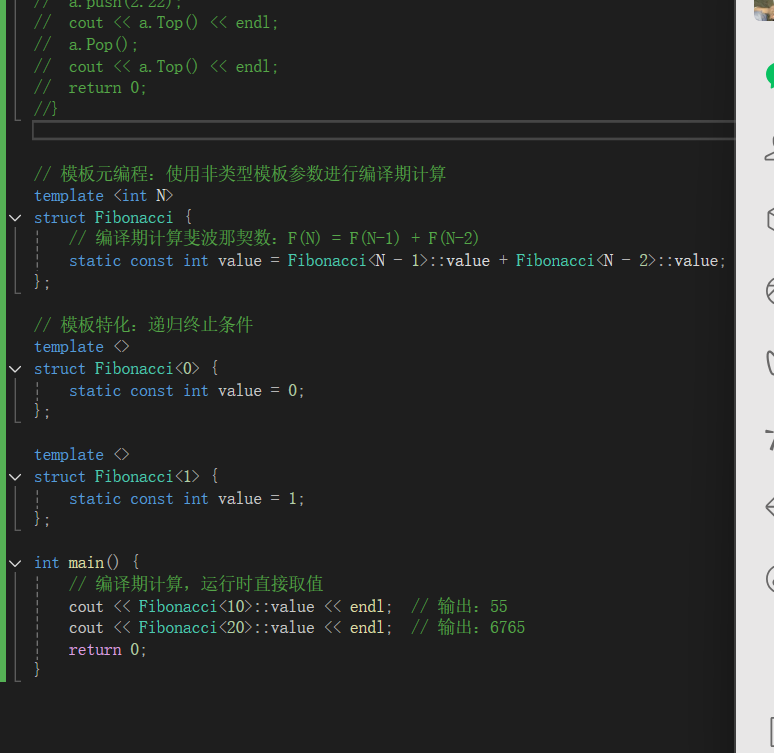 cout << Fibonacci<10>::value << endl; // 输出:55