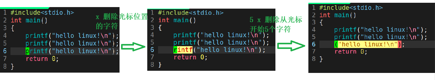 x可以删除光标当前位置的字符,n+x可以删除从光标当前位置开始后面n个位置的字符。
