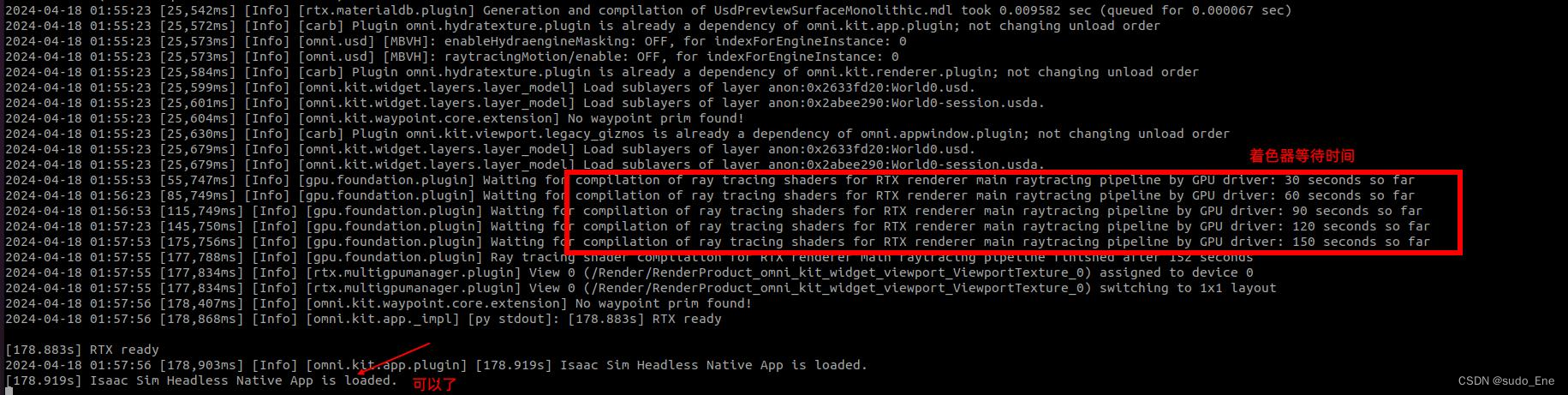 官方文档:(首次加载 Isaac Sim 将需要一段时间来缓存着色器。一旦着色器被缓存并且容器运行时挂载了缓存,后续运行 Isaac Sim 将会很快。请参阅在使用容器时将 Isaac Sim 配置和缓存保存到本地磁盘,以便使 Isaac Sim 配置和缓存持久化。)