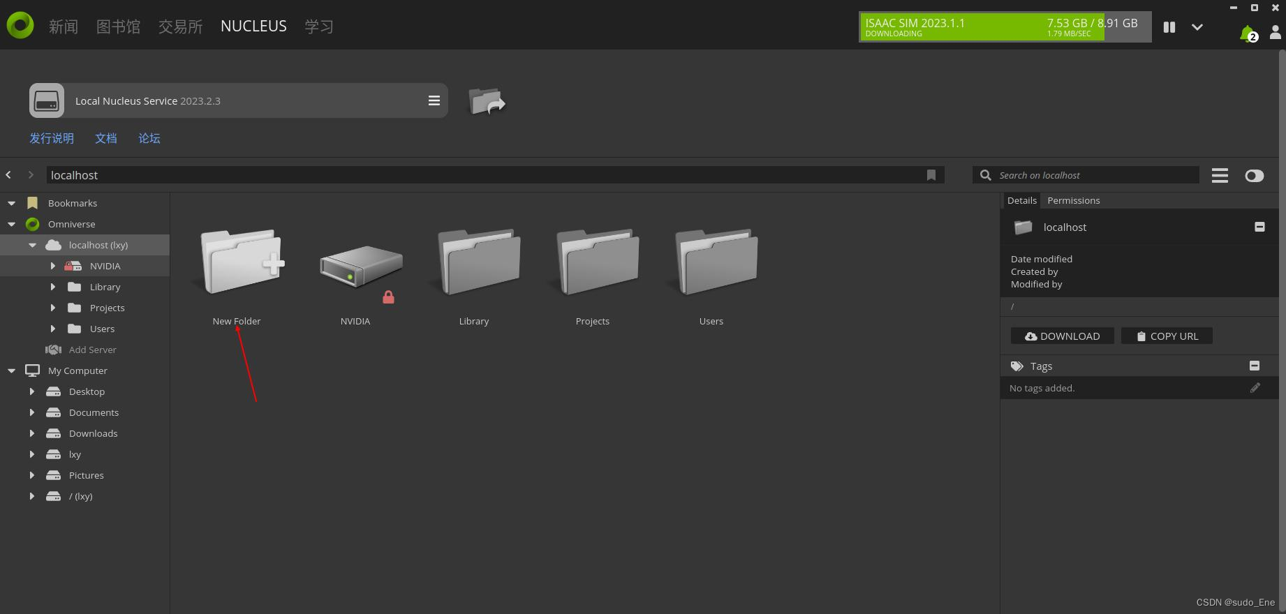 Local host的project,点击New Folder,将usd相关文件放上去即可(第一次可能会需要连接,输入账号密码后按指示来即可)