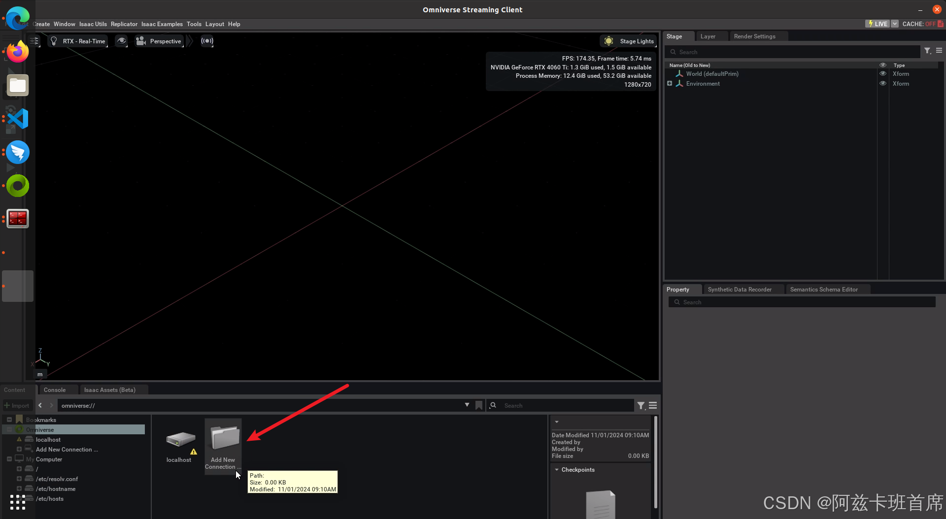 接下来,输入运行 Isaac Sim 容器的机器或实例的 IP 地址,然后点击“连接”按钮。就可以前往Isaac Sim界面了。