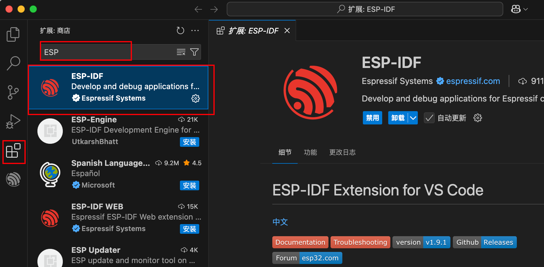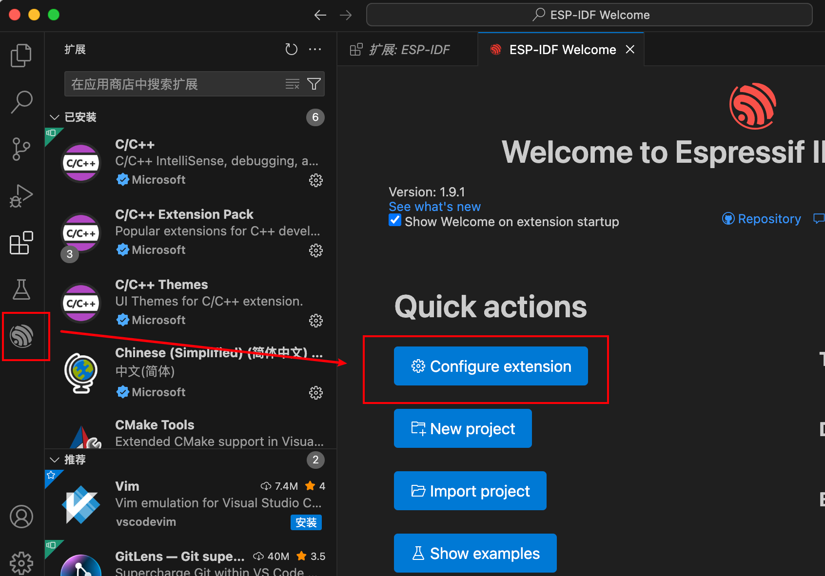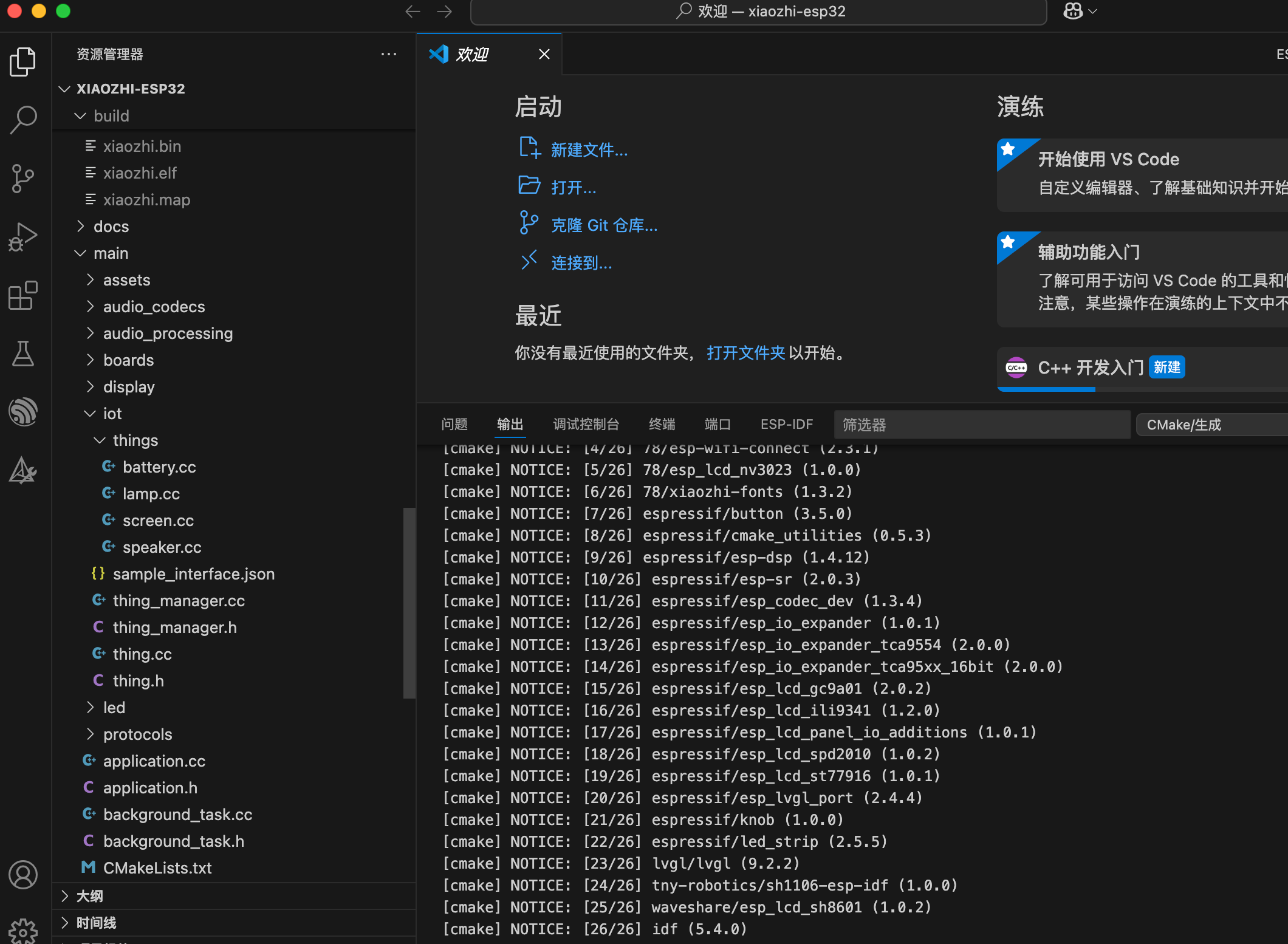 打开下载的XIAOZHI-ESP32源代码文件夹,VSCode加载过程中,会提示安装C++扩展选择安装,ESP-IDF加载等,中途不要取消。