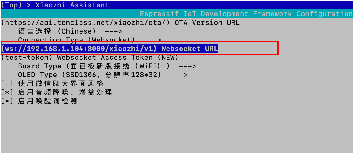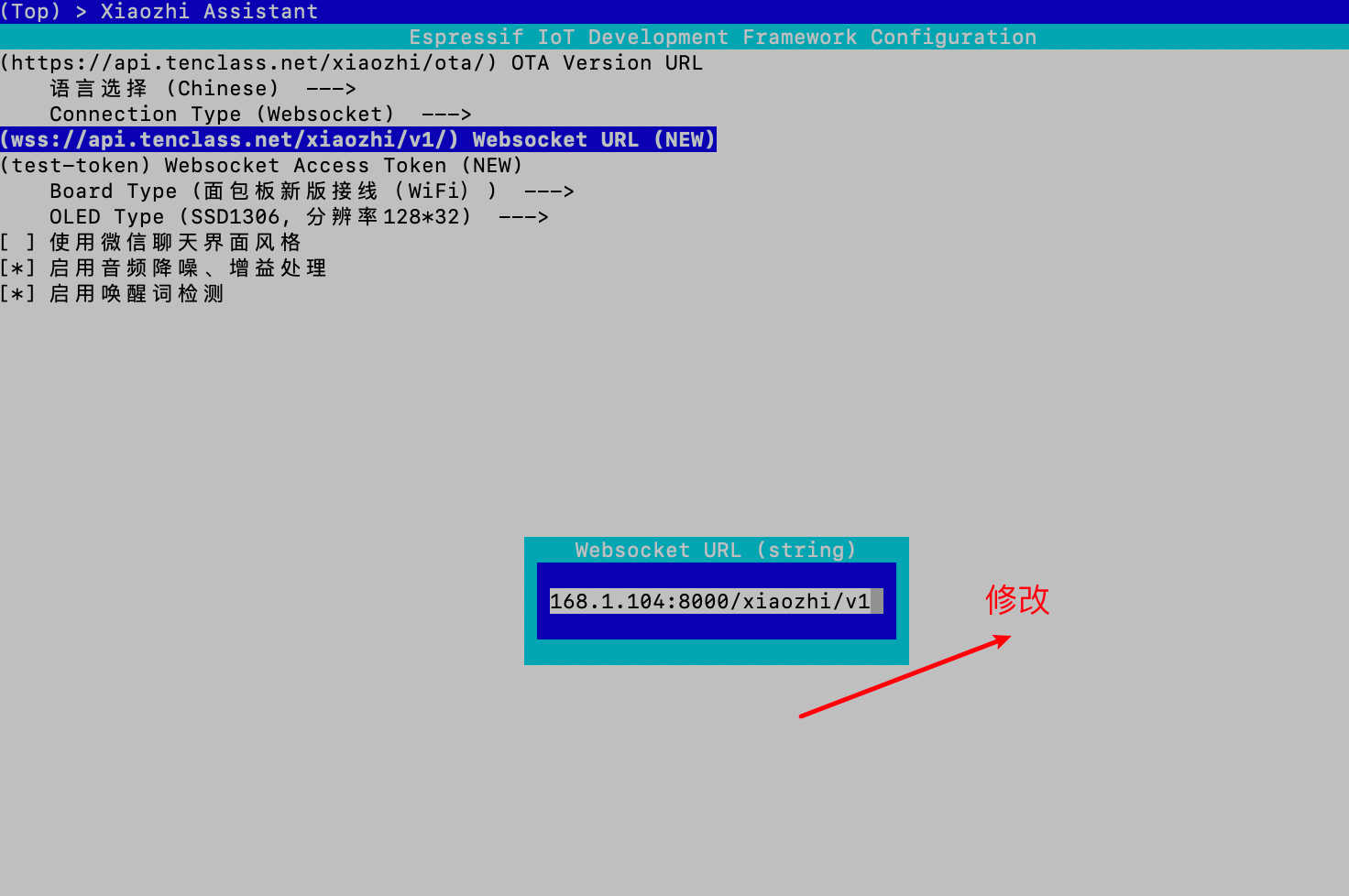 修改websockt地址可以为自己本地的或个人部署的,后面加上/xiaozhi/v1。