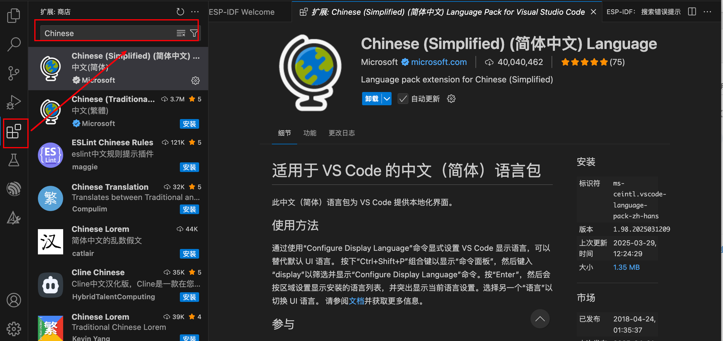 中文语言包安装,安装简体中文,然后重启VSCode。