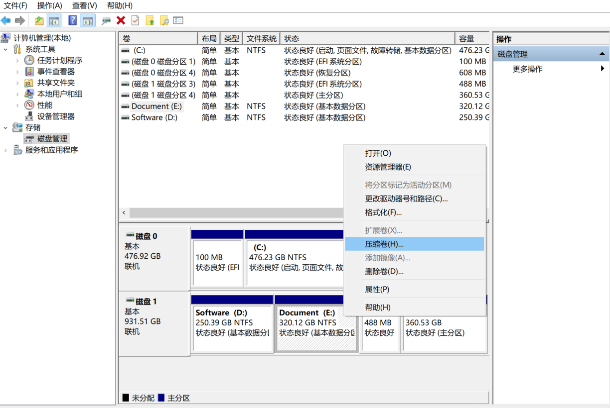 一、分配空闲空间 首先在windows下创建出一块未分配空间,找一块有空闲的卷压缩就行,最好和Ubuntu的空间挨着,不挨着也行,就麻