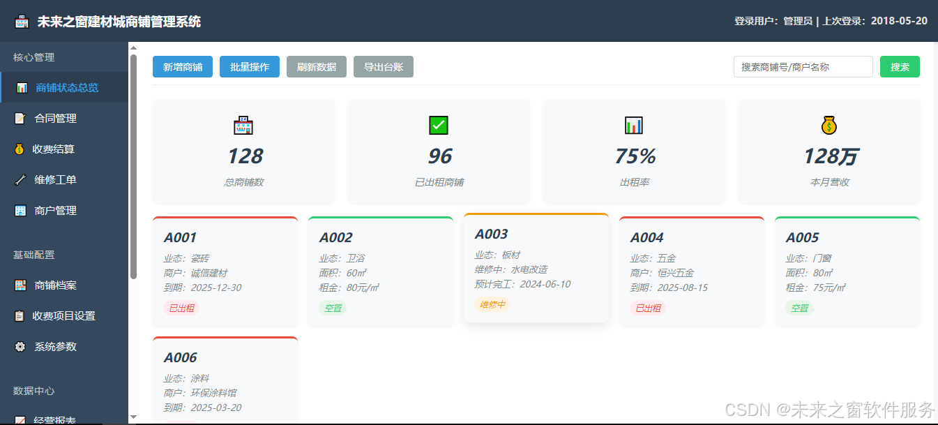 建材城商铺租赁管理系统全场景智慧化租赁运营解决方案“未来之窗建材城商铺租赁管理系统” 是专为建材、家居、五金等专业市场打