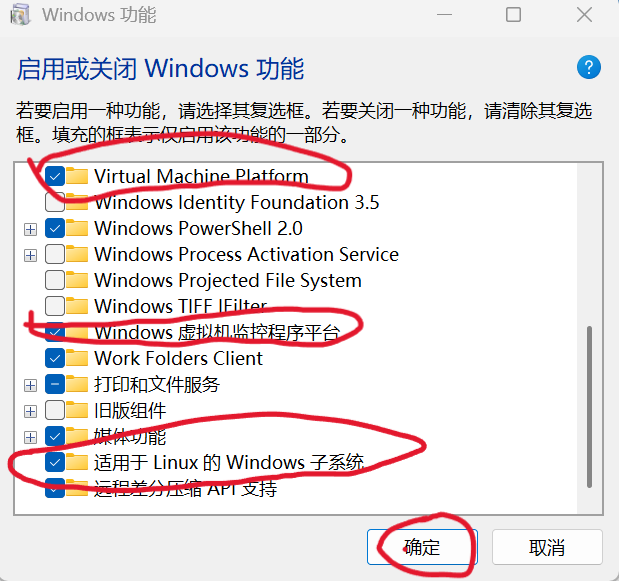 1. 安装WSL2(GUI手动安装) 1.1搜索“启用或关闭Windows功能” 直接应用搜索栏搜索“启用或关···