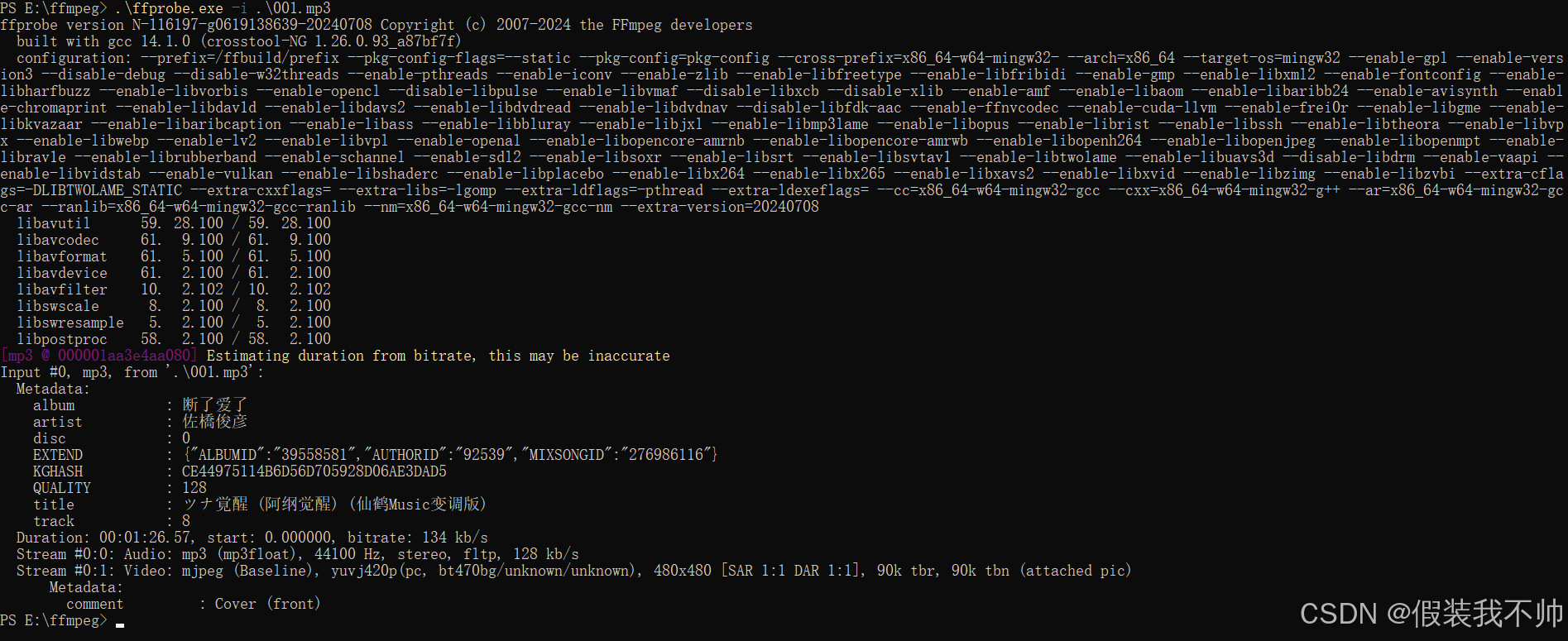 读取mp3信息ffprobe -i input.mp3是视频封面的参数Stream #0:1: Video: mjpeg (Baseline), yuvj420p(pc, bt470bg/unknown/un
