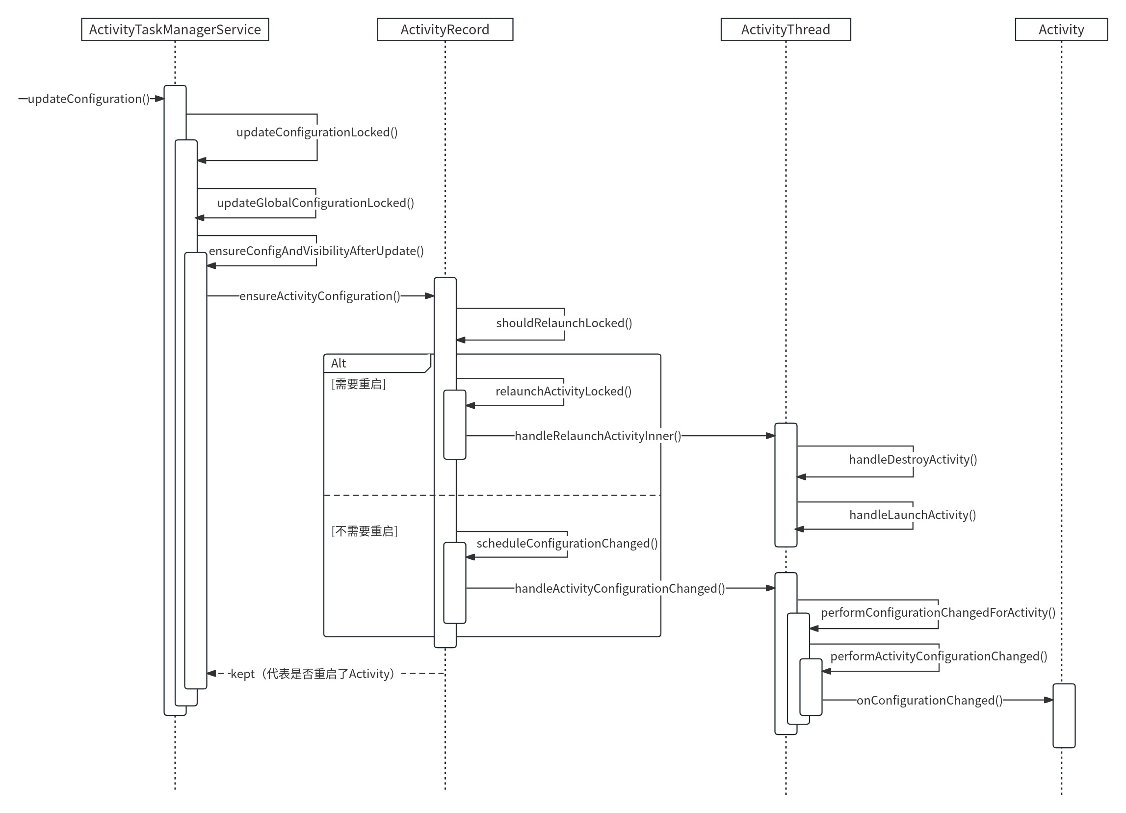 基于Android U,只保留了关键调用步骤,略去了细节。当设备配置发生变更时,系统会调用 ATMS 的 updateConfiguration() 方法